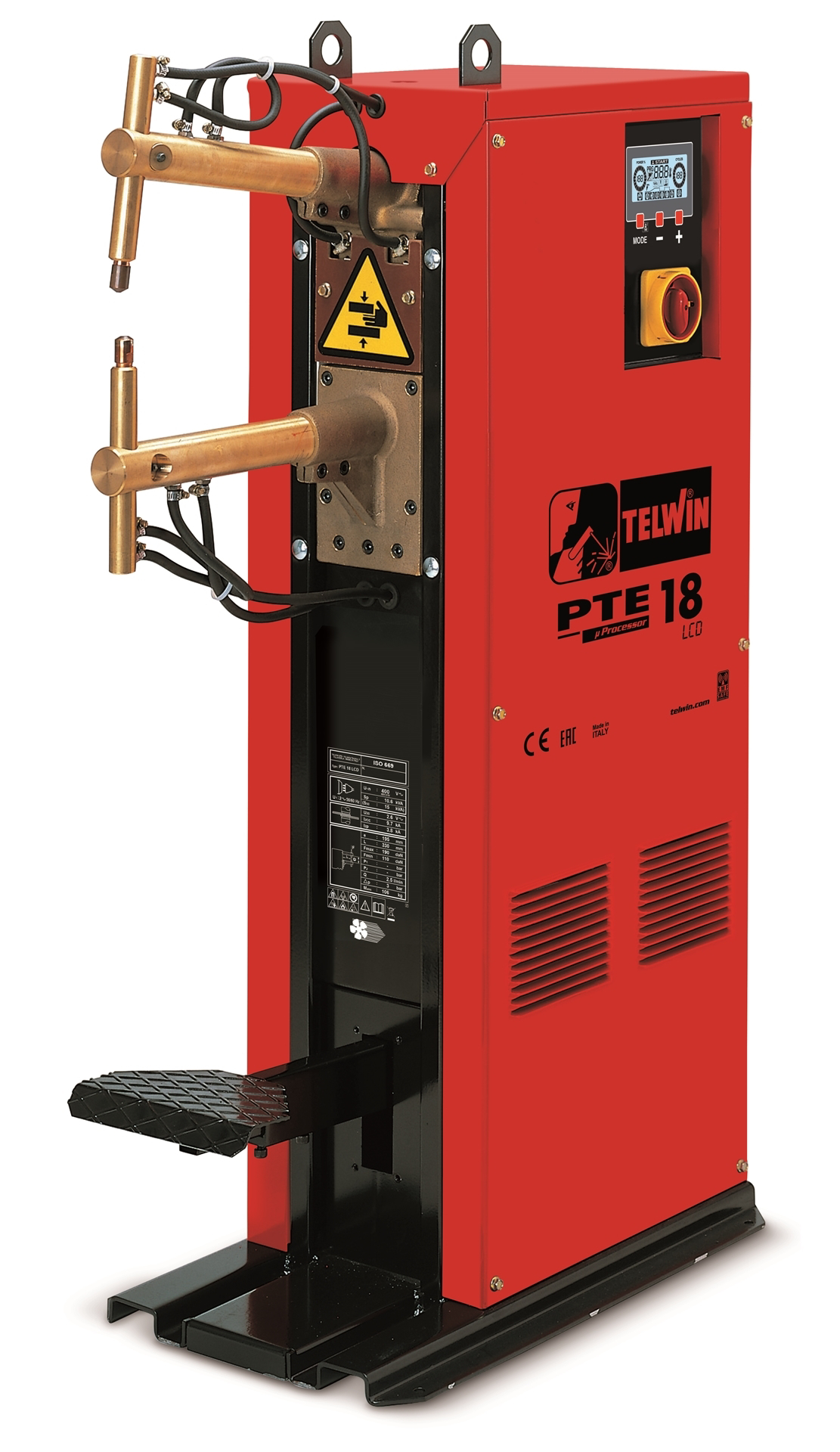 Sloupová bodovací svářečka Telwin PTE 18 LCD pro svařování plechů max. 3+3 mm, 2x 400 V, tyristorově řízená, s mechanickým nožním ovládáním, vodou chlazená, základní délka ramen 500 mm